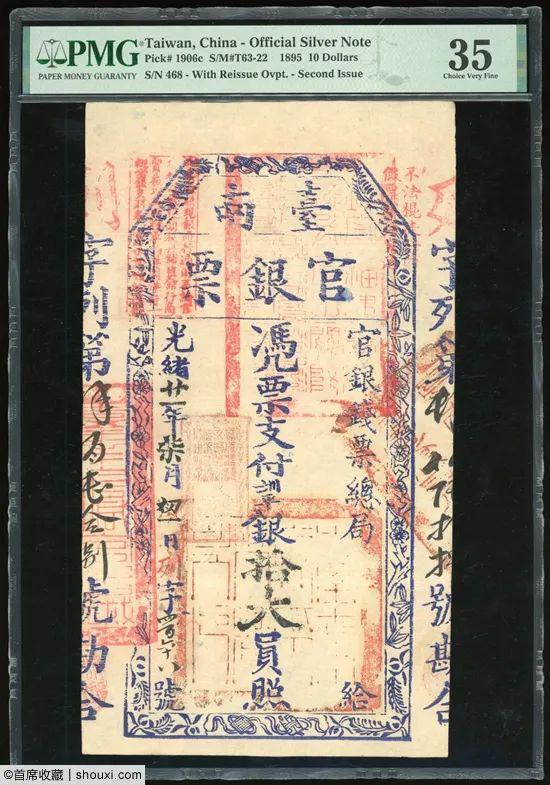 连续3枚PMG-30光绪21年台南官银钱票总局壹大圆官银票,编号不一,依次以1.6万、1.7万和1.6万港币落槌;连续2枚光绪21年台南官银钱票总局伍大圆官银票,第1枚PMG-25左方有微渍2.4万港币落槌;第2枚PMG-25NET稍有洇渍1.1万港币落槌;