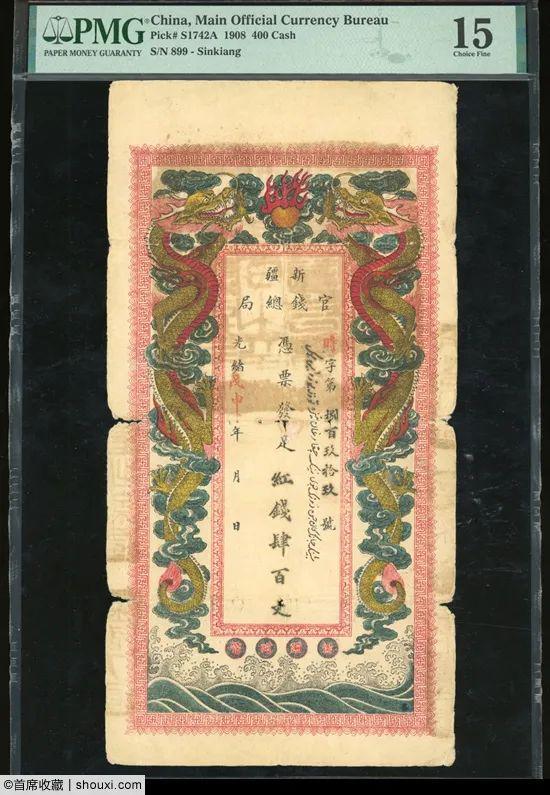 ,PMG-15,有裂,经典品种,是新疆最早发行钞票之一,墨色浓郁,8万港币落槌,含佣约合人民币9.12万元成交。民国38年新疆省银行贰角,PMG-64,冠军分,稀有好品相,包浆原始,1.2万港币落槌;民国18年热河兴业银行伍角,PMG-63EPQ,稀有较早期版别,冠军分,1.2万港币落槌;光绪21年台南官银钱票总局壹大圆官银票,PMG-30,带原厂细孔,中央盖反向虎印,1.6万港币落槌。